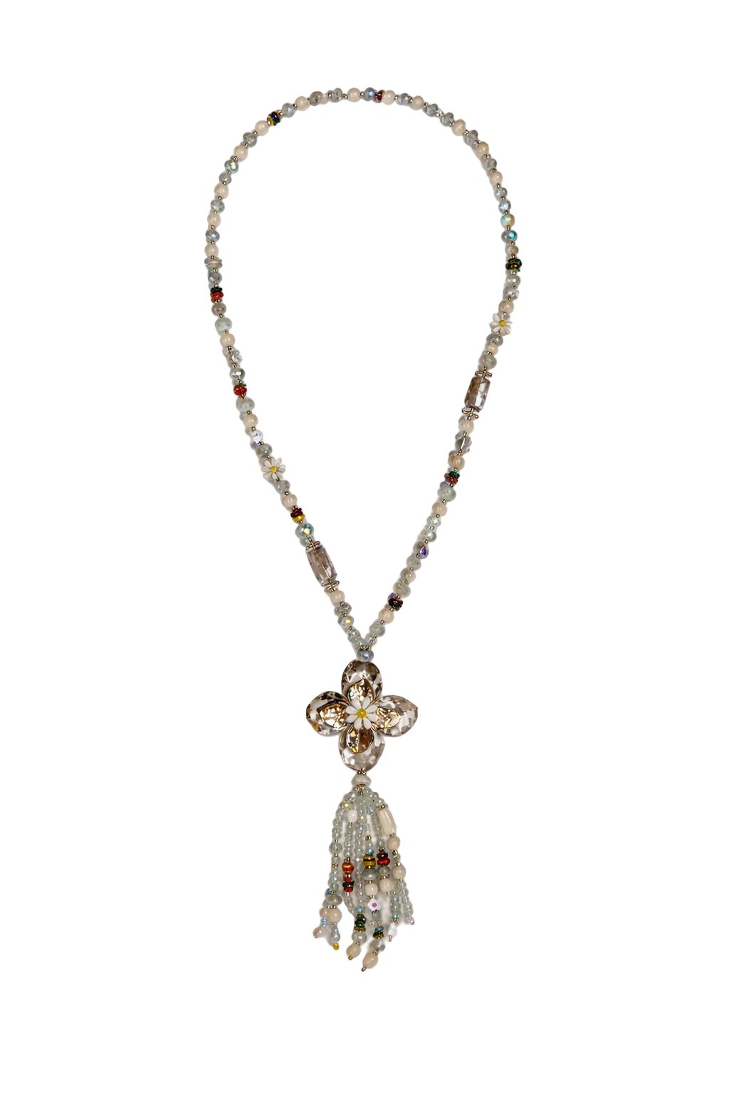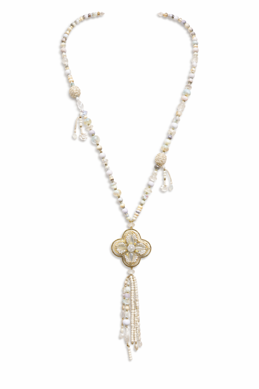 Collier long écru médaillon fleur et pompon