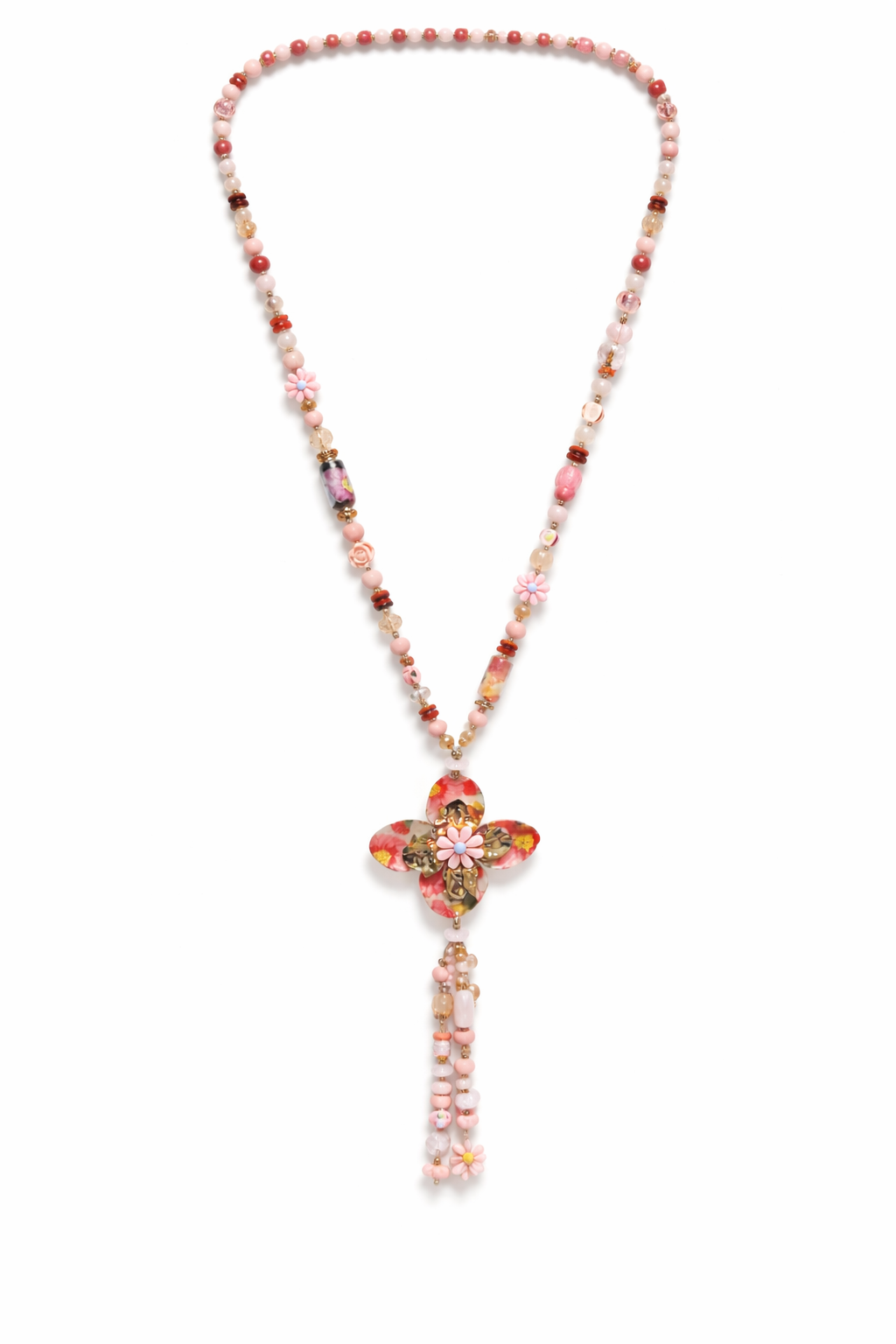 Collier long rose médaillon fleur et pompon