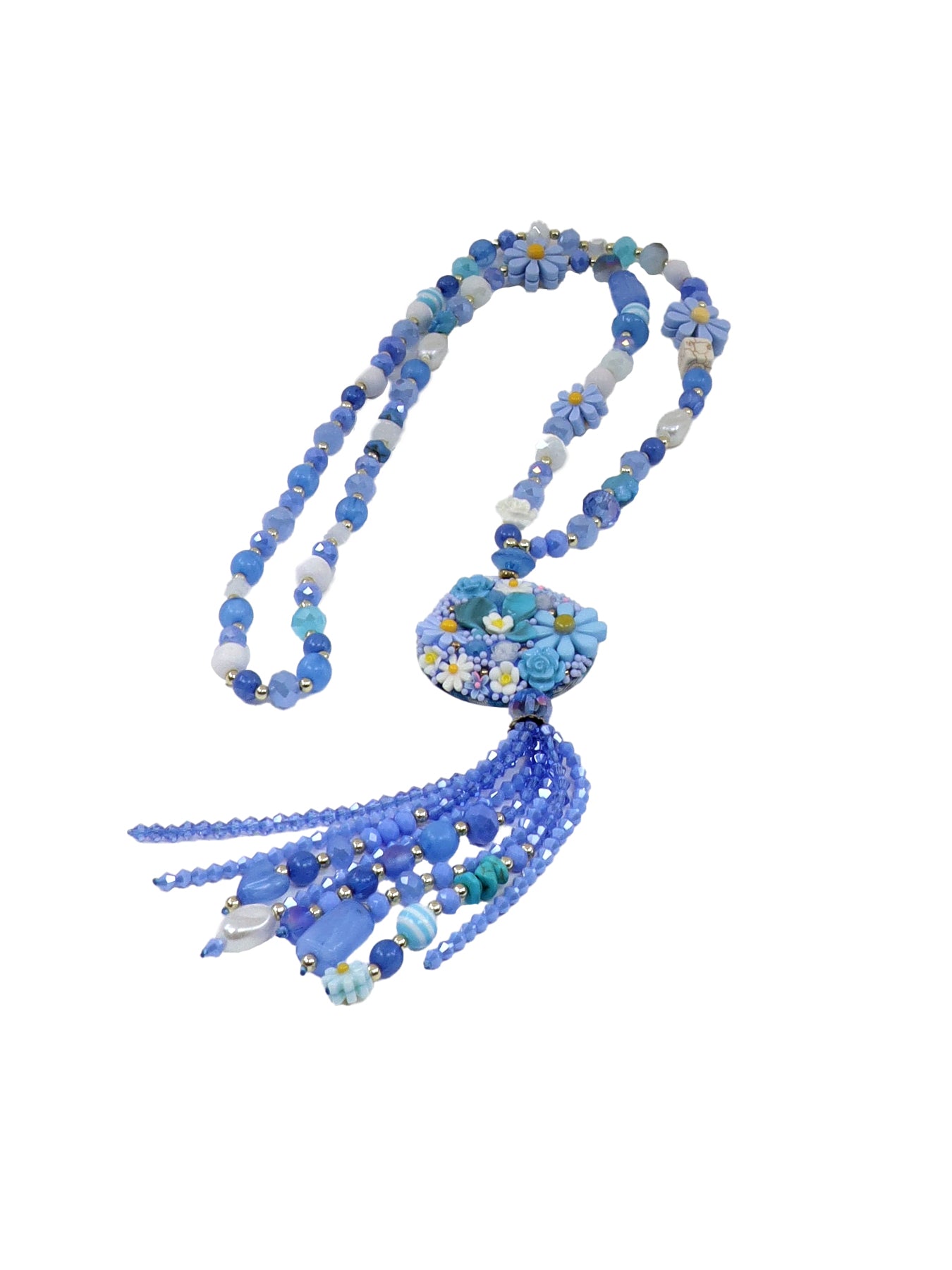 collier bleu pastille fleur et pompon