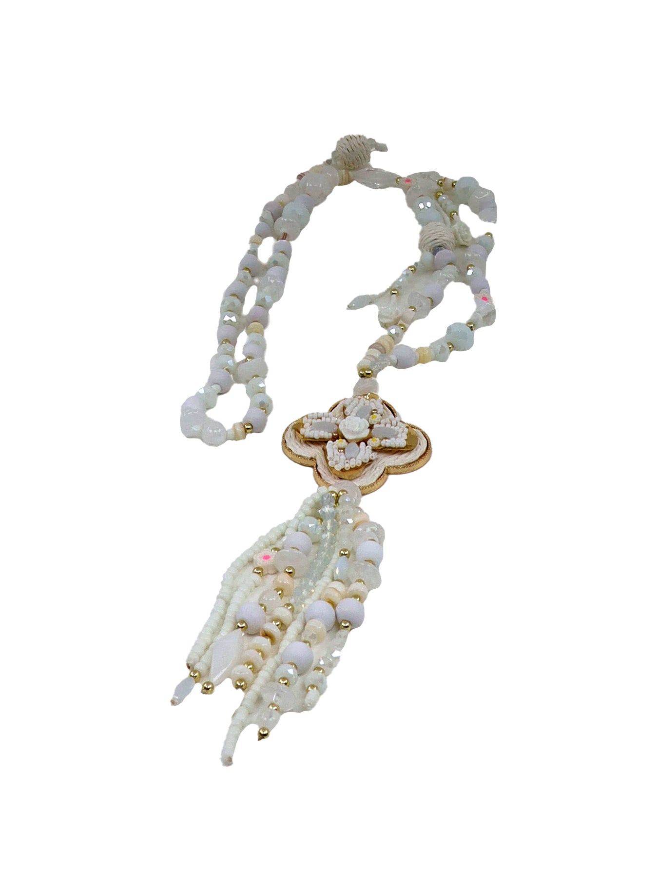 Collier long beige médaillon fleur et pompon