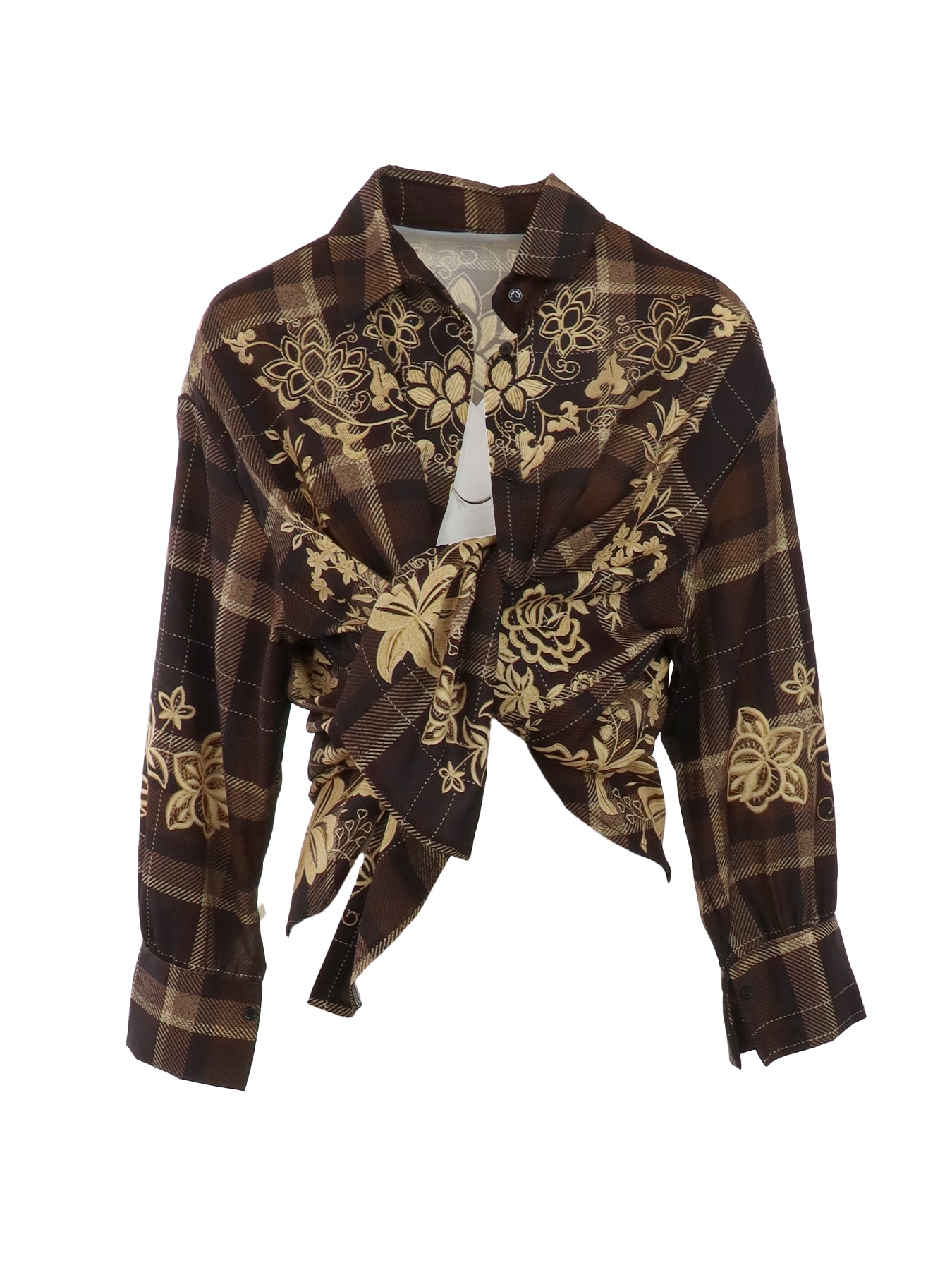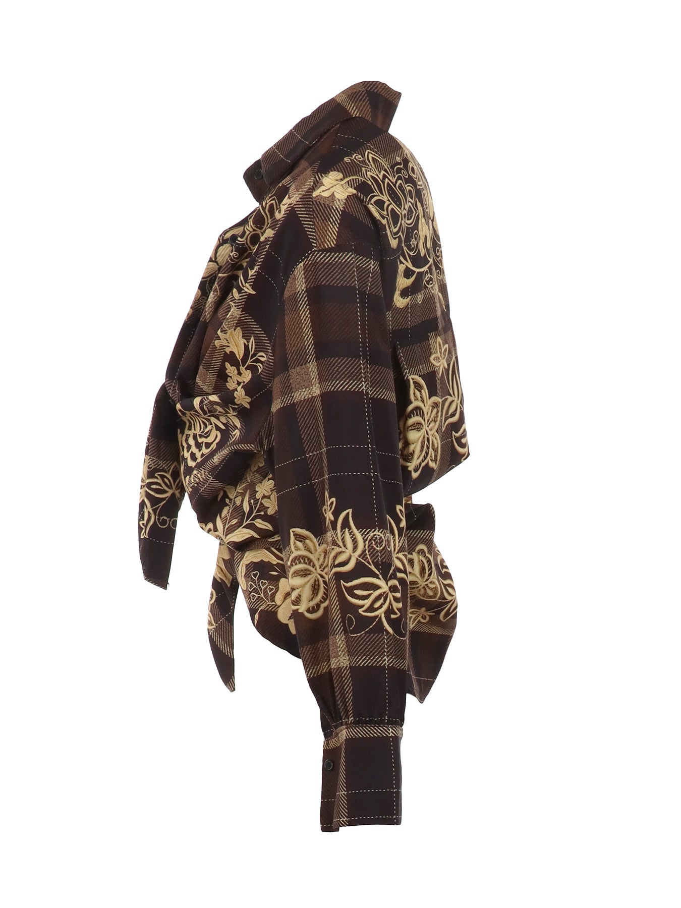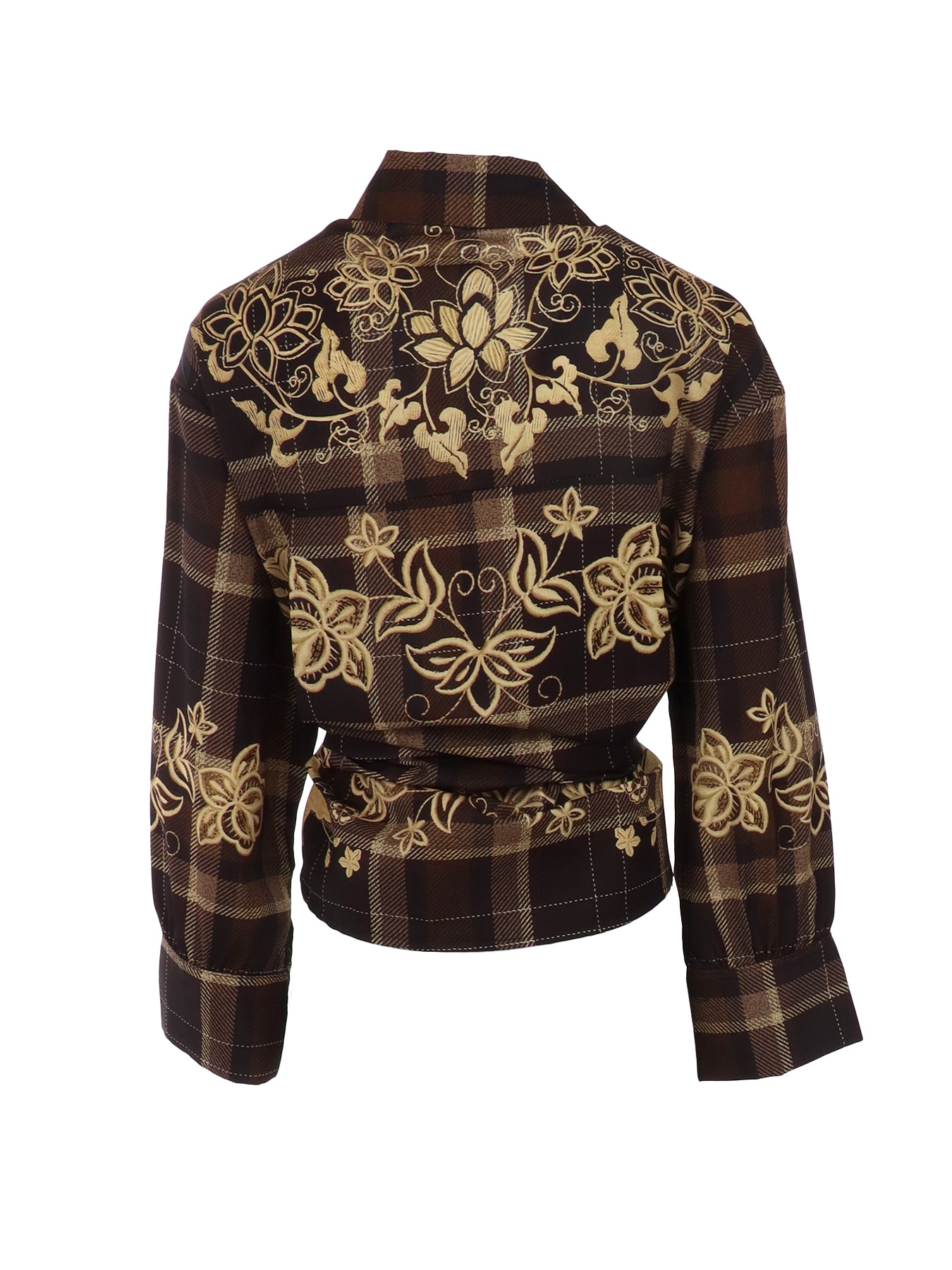 Chemise longue à carreaux cacao broderie fleurs Carla
